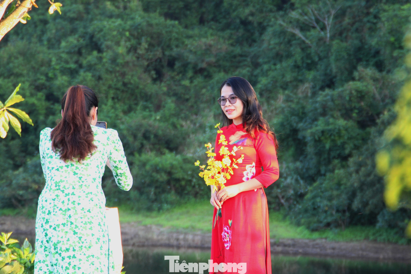 | Những tiểu cảnh được trang trí ngập sắc Xuân truyền thống với bánh chưng xanh, câu đối đỏ... được các em nhỏ yêu thích. Nhiều gia đình đưa con đến chụp ảnh trong trang phục áo dài để lưu lại những khoảnh khắc rực rỡ chào năm mới. |