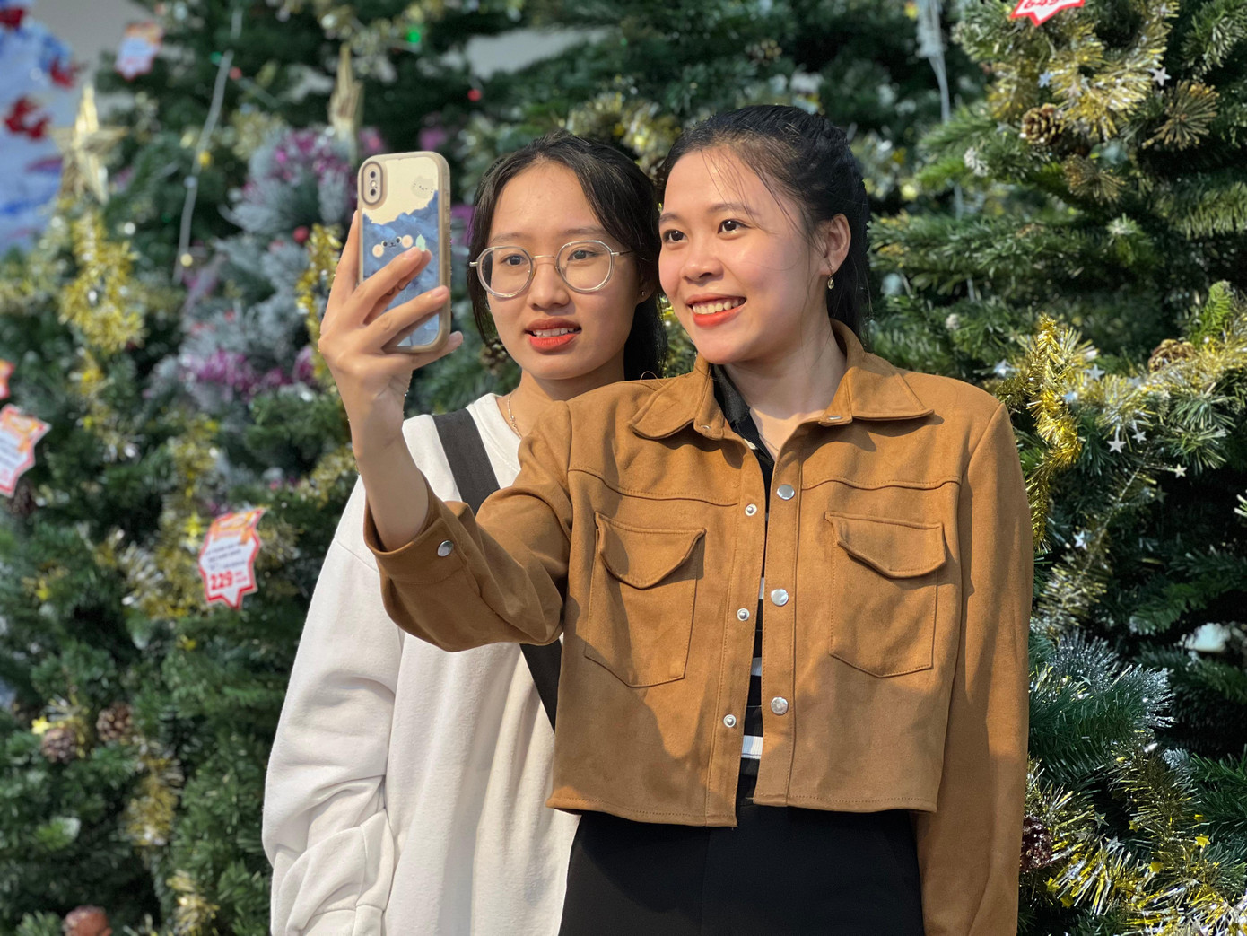 | Bạn Phan Ngọc Anh Thư (trú Quảng Nam) cùng một người bạn chụp ảnh cho nhau tại một cửa hàng với cây thông trang trí. "Năm nay, em thấy đồ đa dạng, đẹp mắt nên rất hào hứng sống ảo tại đây mà không sợ trùng nhau", Thư chia sẻ. |