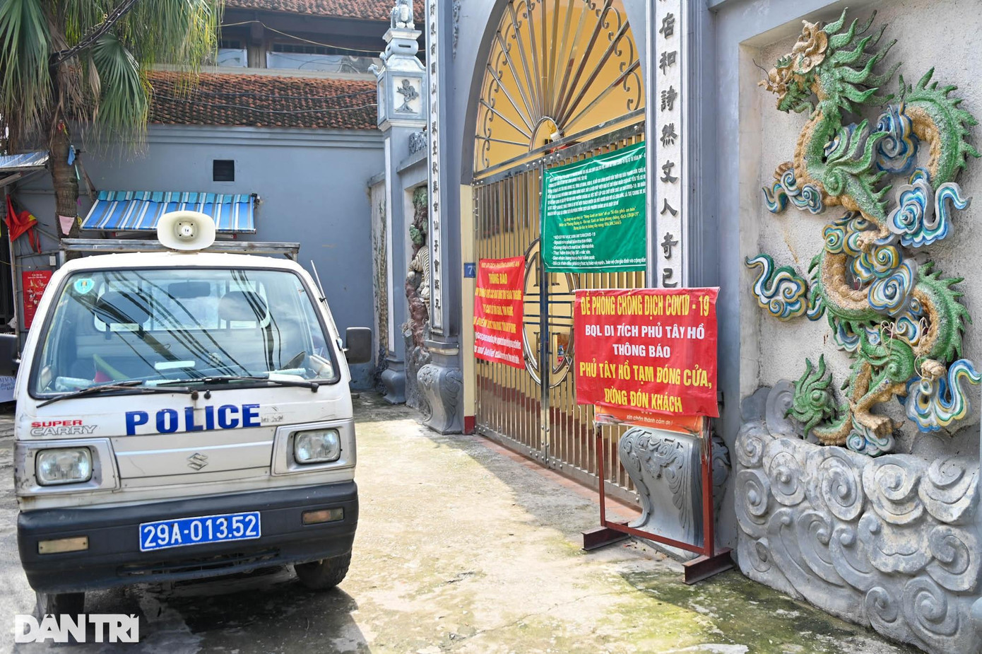 Trái ngược với không khí có phần đông đúc ở chùa Hà, tại Phủ Tây Hồ lực lượng chức năng đã lập hàng rào cứng lại các lối vào của Phủ, hạn chế tối đa việc người dân tụ tập quanh khu vực này.