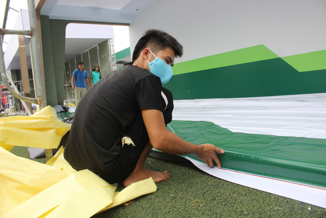 “Công tác chuẩn bị cho gian hàng của LienvietPostBank tại Sân vận động Bách Khoa A1 Lê Thanh Nghị đã diễn ra từ ngày hôm qua (5/11) và tính đến trưa 6/11 chúng tôi đã thực hiện được hơn 50% tiến độ công việc, dự kiến, 20h hôm nay sẽ hoàn thiện", Anh Đỗ Đăng Tiến (29 tuổi), đơn vị thi công gian hàng của LienvietPostBank tại Ngày thẻ Việt Nam 2020 cho biết.