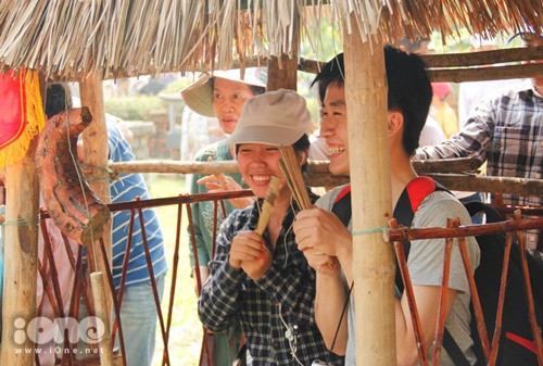 Nhiều bạn trẻ lần đầu tiên trải nghiệm cảm giác chơi bài chòi, một loại hình chơi bài tuyền thống của người Việt với những cây bài được làm bằng que tre.