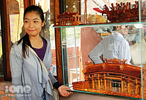 Một bạn gái tỏ ra thích thú với các mặt hàng lưu niệm siêu kute như hình con trâu, cái cày, lũy tre làng, cầu ngói…
