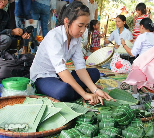 Nghề làm bánh lọc, bánh chưng, bánh tét truyền thống cũng được tái hiện. Anh Đào, lớp 7 trổ tài làm bánh thuần thục của mình cho du khách xem.