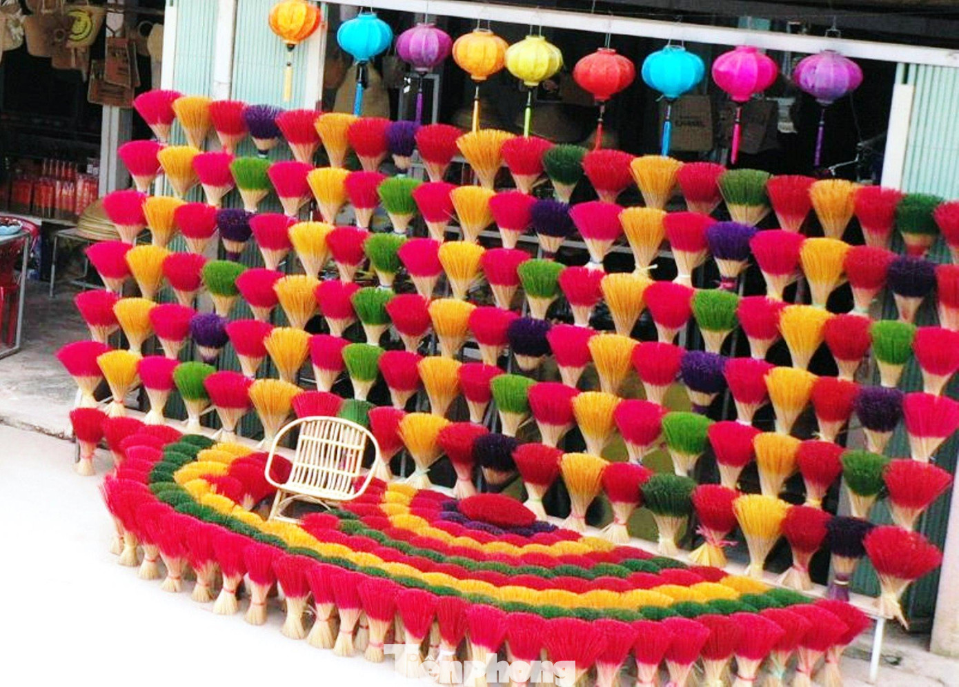 | Điểm dễ nhận biết khi đến với làng trầm hương Thủy Xuân đó là sự rực rỡ nhiều màu sắc của những tăm hương, lõi hương bằng tre dùng làm nguyên liệu để chế tạo nên sản phẩm hương thắp hoàn chỉnh. Bên cạnh đó là mùi hương trầm tỏa ngát ngất ngây quyến rũ cả một vùng. Ảnh: NSNA Thiên Minh |