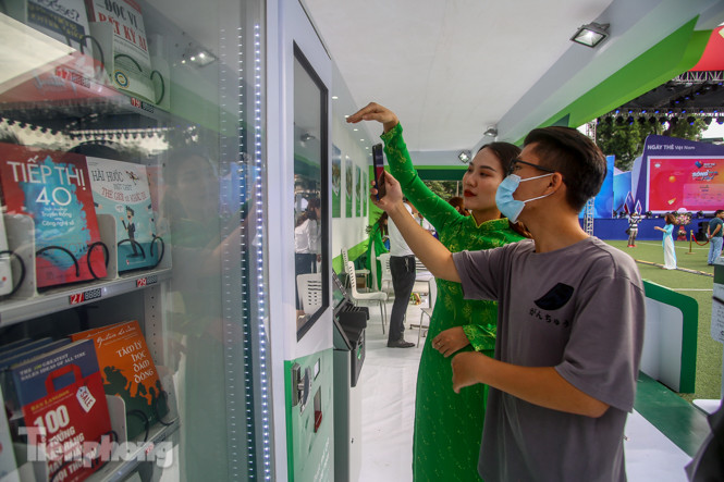 Quét mã QR mua sách tự động tại quầy Vietcombank.