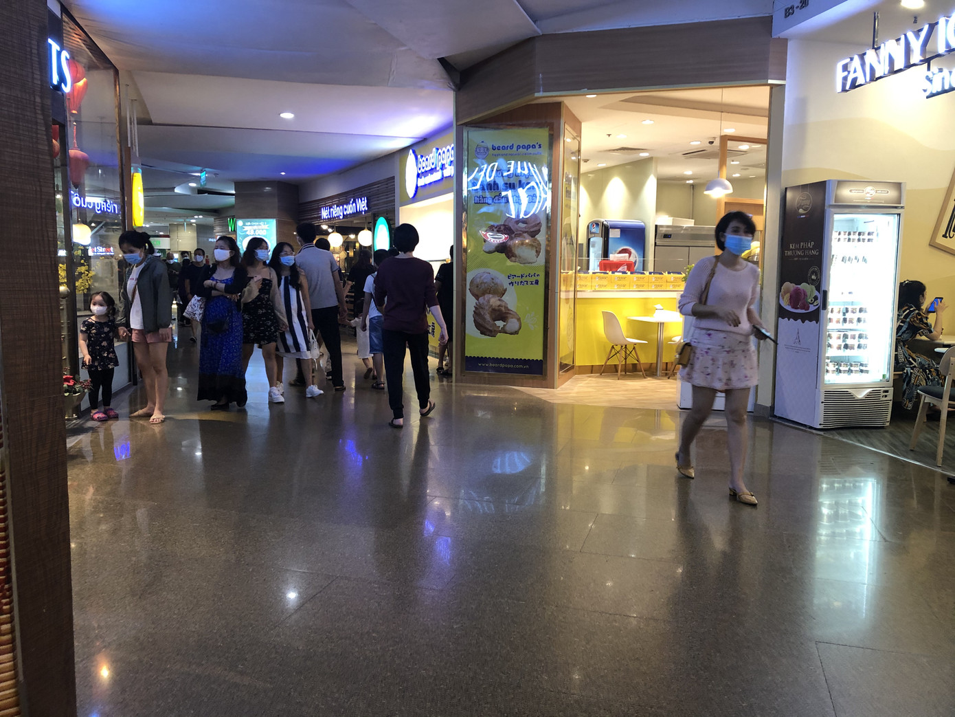 Tại một trung tâm thương mại (TTTM) ở đường Đồng Khởi, khu vực nhà hàng, quán cà phê là những nơi có lượng người tập trung đông. Dù vậy, những biện pháp bảo vệ an toàn cho người dân vẫn được đề cao. Cụ thể, ngay tại cửa ra vào, người dân đều được nhân viên bảo vệ đo thân nhiệt và xịt khuẩn tay. Tại cửa ra vào của các cửa hàng cũng có các bình nước rửa tay khô để nhân viên và khách hàng sử dụng.