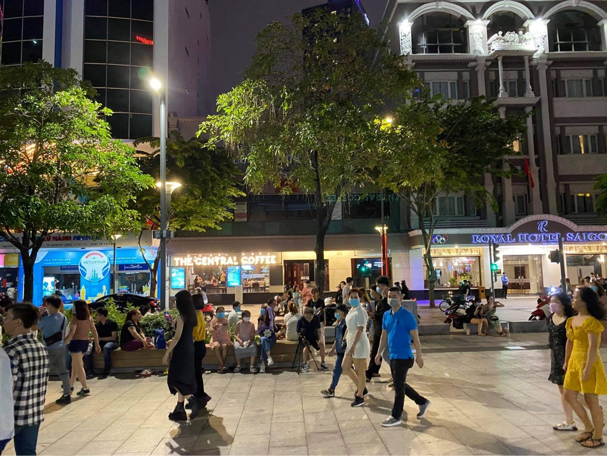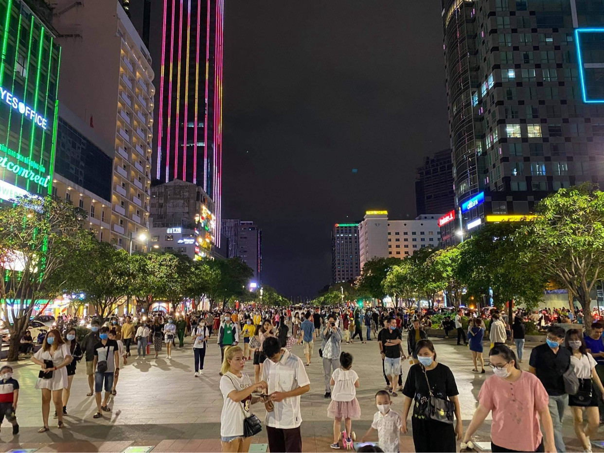 Tại phố đi bộ Nguyễn Huệ, năm nay do tình hình dịch bệnh nên không diễn ra các hoạt động bắn pháo hoa hay biểu diễn văn nghệ ngoài trời. Các bạn trẻ chọn cách quây quần, tạo thành các nhóm nhỏ để trò chuyện rôm rả. Theo ghi nhận, hầu hết người lớn lẫn trẻ em đều sử dụng khẩu trang khi tham gia các hoạt động trên phố đi bộ.