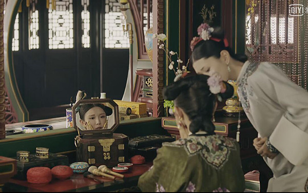 Với các cung tần mỹ nữ trong hoàng cung, chăm sóc sắc đẹp là điều rất quan trọng. Bộ phim Diên Hy công lược cũng thể hiện rõ chi tiết này khi thường xuyên quay cảnh các phi tần đang "tút tát" nhan sắc. Trên bàn trang điểm của họ là đủ loại mỹ phẩm ngày xưa như phấn nén, má hồng, son môi...
