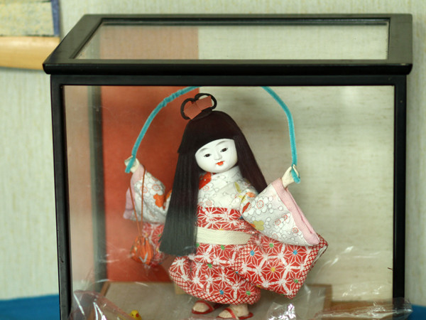 | Cùng với Daruma còn có những búp bê khác được trưng bày: Kimono bằng sứ, bên ngoài là lớp áo bằng vải và giấy bồi. |