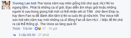 Khán giả Phạm Ngọc Mộc Miên bày tỏ: “Người ta nói " Gừng càng già càng cay" thiệt là quá đúng. Mấy mùa trước Đàm Vĩnh Hưng, Tuấn Hưng, Thu Phương… làm HLV cái cách mà họ hoạt náo trên sân khấu hoàn toàn khác xa bây giờ. Họ tinh tế hơn nhiều khéo léo hơn. Còn hiện tại thì HLV giống như bị tăng động, nhí nhố hết chỗ nói”.
