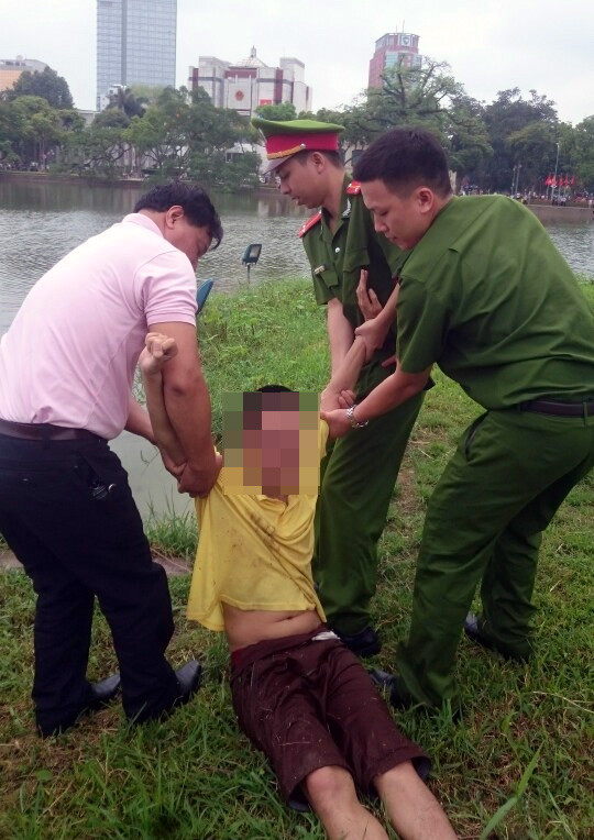 Sau một hồi thuyết phục không được, tổ công tác Công an quận Hoàn Kiếm quyết định khống chế thanh niên này để đưa vào bờ, tránh sự tụ tập của những đám đông hiếu kỳ đang theo dõi vụ việc trên bờ. Lúc này, thanh niên trên lao vào cào cấu các chiến sỹ, khiến Đại uý Dũng bị trầy xước ở tay.