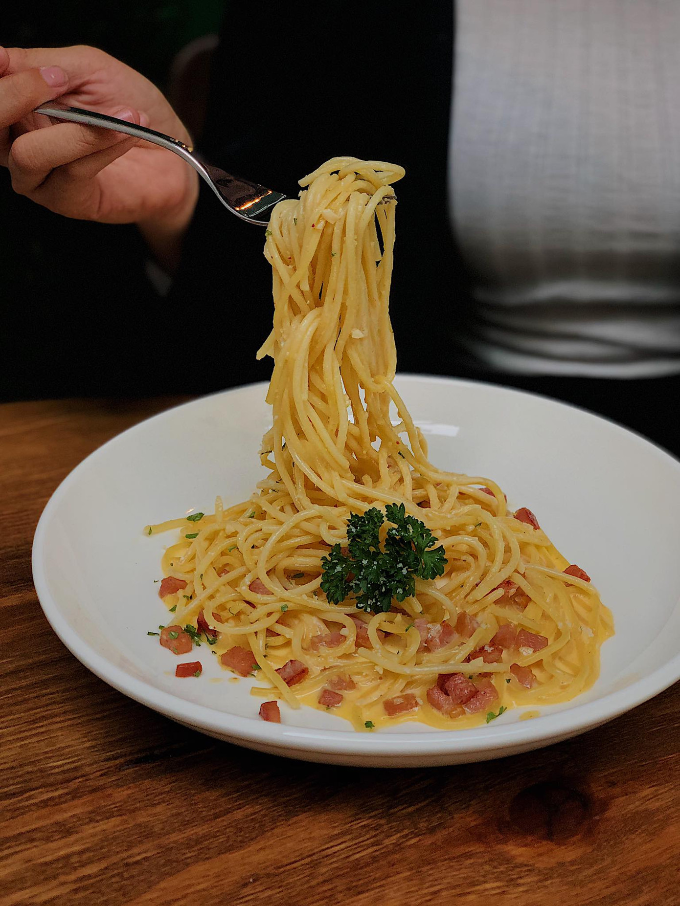 Mỳ Ý Carbonara | Spaghetti Carbonara (72K): Sợi mì chín đều, mềm dai hợp lý với sốt phô mai và xúc xích, không biết ngon không mà chỉ chưa đầy một phút dĩa mì đã hết veo.