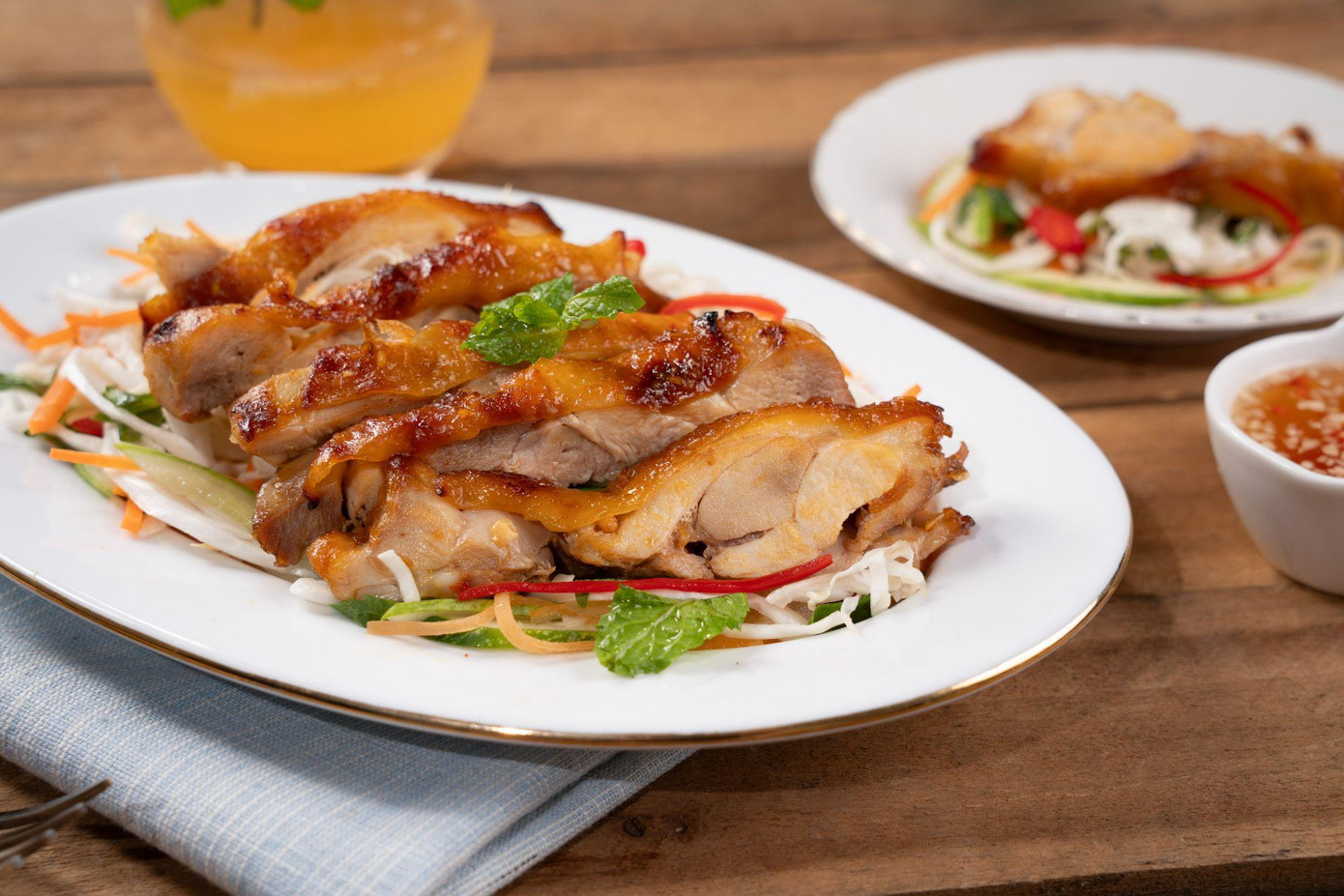 2. Nướng thịt gà cho đến khi vàng đều hai mặt bằng nồi chiên không dầu hoặc bếp than, sau đó thái lát mỏng.