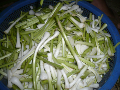 Những cây tỏi đực được rửa sạch, luộc qua rồi trộn cùng các loại gia vị, rau thơm thành món gỏi ăn bổ dưỡng. Ảnh: Lý Sơn
