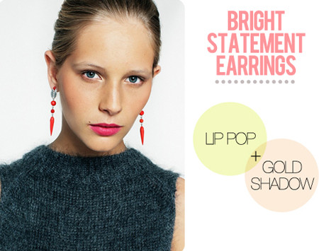 Khi chọn một đôi bông tai màu sắc tươi sáng, rực rỡ, bạn hãy kết hợp với son môi cùng tông. Đây là cách trang điểm hoàn hảo làm khuôn mặt bừng sáng. Không nhất thiết phải sử dụng màu son y chang như khuyên tai nhưng bạn nên các gam màu tươi tắn như: hồng sen, đỏ tươi, cam sáng. Bên cạnh đó, đừng bỏ qua bước trang điểm mắt. Một chút phấn nhũ vàng hoặc xám khói sẽ đem lại tổng thể hài hòa cho gương mặt.