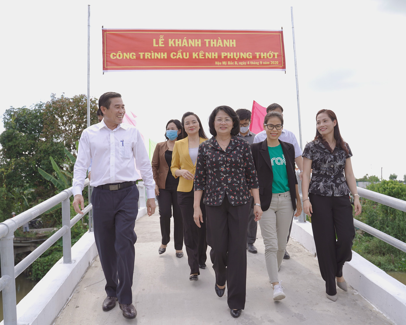 Tại buổi lễ khánh thành, Phó Chủ tịch nước Đặng Thị Ngọc Thịnh đã cùng Lãnh đạo Quỹ, Lãnh đạo UBND tỉnh, đại diện các Sở, Ban, Ngành tỉnh Tiền Giang và Đại diện Nhà tài trợ Công ty TNHH Grab cắt băng khánh thành, bàn giao công trình cầu Kênh Phụng Thớt.