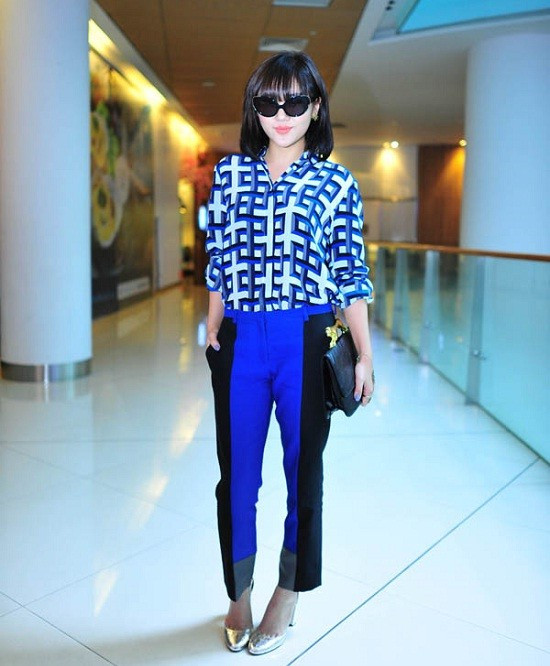 Áo và quần của Văn Mai Hương không mấy ăn nhập. Nếu thay áo này bằng chiếc sơ mi xanh hay kiểu áo tông xuyệt tông với quần sẽ giúp cô nàng nổi bật rất nhiều.