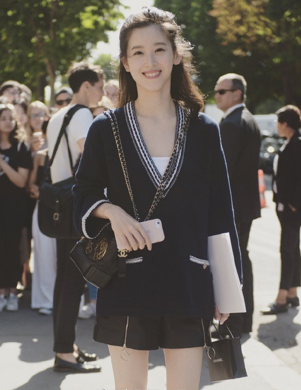 Chương Trạch Thiên phối áo len và quần short dự show thời trang của hãng Chanel.