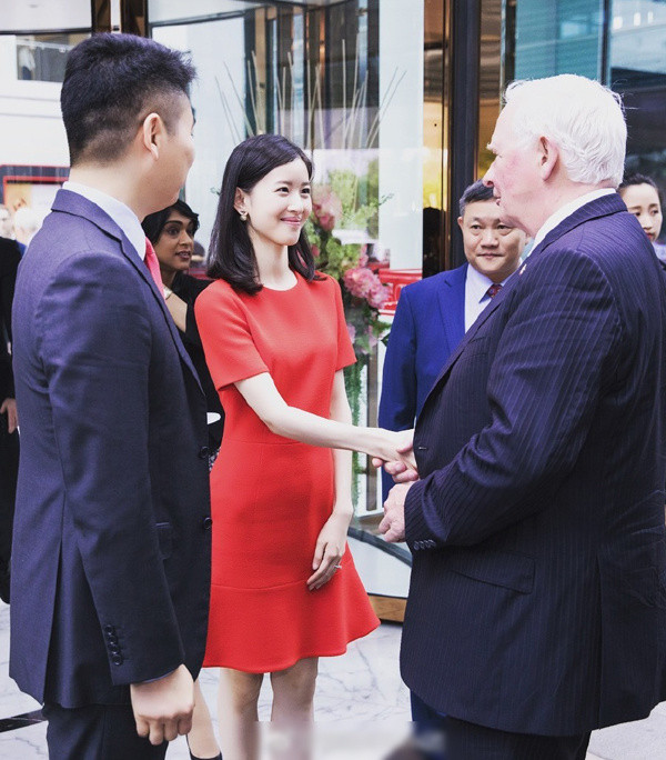 Chương Trạch Thiên diện đầm đỏ nổi bật trong buổi tiếp khách công ty của vợ chồng cô.
