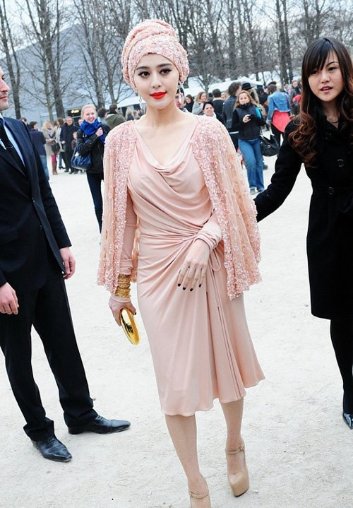 Băng Băng kết hợp váy của Elie Saab với áo sheer và khăn trùm đầu đính hoa cầu kỳ, tất cả đều cùng tone nude thanh lịch, nhã nhặn, đồng thời sử dụng phụ kiện ánh vàng sang trọng.