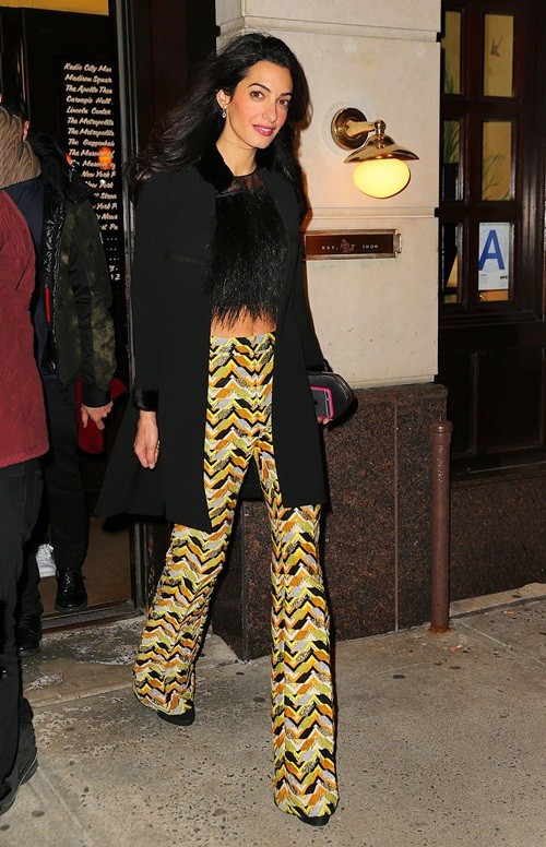 Từ nhà ra phố, nữ luật sư chọn gu mặc linh hoạt, không bị gò bó theo một phong cách nhất định nào. Có lúc, Amal cá tính với quần skinny, áo crop-top và vest dáng dài kẻ sọc caro (trái). Lúc khác, cô thùy mị với áo xếp nếp in hoa, quần skinny và giày đế xuồng.