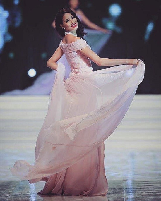 Chiếc váy dạ hội màu hồng phấn của cô khi tham dự Hoa hậu Hoàn vũ nhận được nhiều lời khen vì độ thanh lịch. Người đẹp kết hợp vòng cổ ngọc trai để làm tăng thêm vẻ nữ tính cho trang phục.
