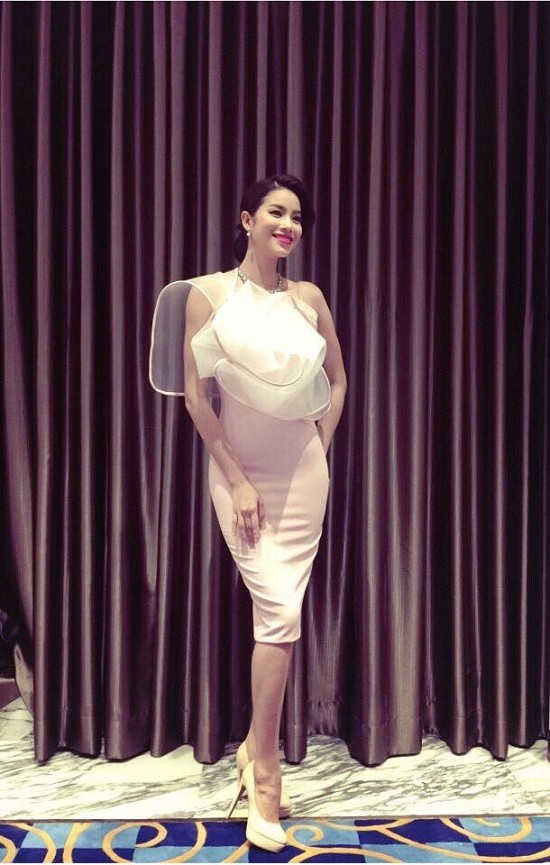 Chiếc váy màu nude với cách điệu là lớp bèo trước ngực. Với style sự kiện, Phạm Hương không mix nhiều chi tiết để làm nổi bật vẻ đẹp cũng như vóc dáng.