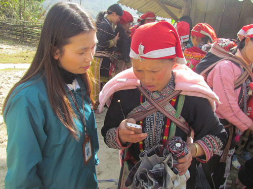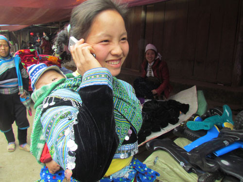 Gù Thị Xớ (17 tuổi, người Mông) vừa phụ mẹ ngồi bán những sợi chỉ màu sặc sỡ trong phiên chợ xuân, vừa cầm điện thoại màn hình cảm ứng lướt thành thạo mở nhạc, gọi điện cho bạn bè hẹn hò nhau sau khi bán xong hàng. "Có điện thoại này từ năm ngoái, nghe nhạc thích lắm!", Xớ nói bằng tiếng Việt không sõi lắm. Không chỉ riêng Xớ, xung quanh em, hầu hết các mẹ, các chị, các bạn trẻ đều mang theo điện thoại, sẵn sàng lấy ra, kéo danh bạ, bấm số thành thạo.