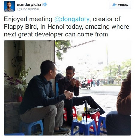 Trong khi đó, về phần mình, CEO Google Sundar Pichai cũng đã chia sẻ lên trang Twitter cá nhân hình ảnh đang ngồi uống trà vỉa hè với Nguyễn Hà Đông, cùng thông điệp: “Thích thú với buổi gặp mặt @dongatory, người sáng tạo của Flappy Bird, tại Hà Nội, là nơi có thể tạo ra nhà phát triển tuyệt vời khác”. Trong đó, @dongatory chính là tài khoản Twitter của Nguyễn Hà Đông đã được Sundar Pichai tag vào trong đoạn thông điệp của mình.