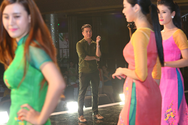 Anh tỉ mỉ quan sát thí sinh trình diễn và trao đổi với Jennifer Phạm, cựu người mẫu Thúy Hằng để tìm ra những gương mặt sáng giá cho chiếc vương miện.