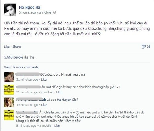 Với những thông tin trái chiều này, Hồ Ngọc Hà tỏ ra khá tự ái và bức xúc. Cô lại chọn cách lên tiếng trên trang cá nhân: “Lấy tiền thì nói tham, không lấy thì nói ngu, thế tự lập thì bảo gì? Khổ? Ừ số khổ, cày đi Hà à. Có mấy ai mỉm cười mà không bước qua đau khổ. Chung nhà, chung giường, chung con là đủ vui rồi. Ở đời cứ động tới tiền là mất vui, nhỉ?".