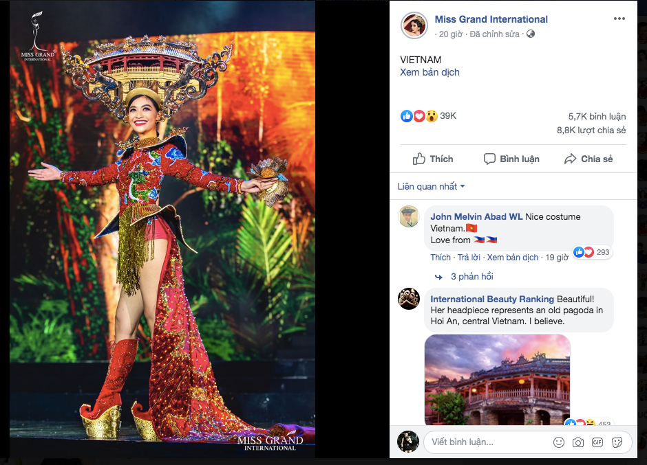 Bộ quốc phục của Á hậu Kiều Loan tại Miss Grand 2019 tiếp tục nhận được sự bình chọn 'khủng' từ khán giả.