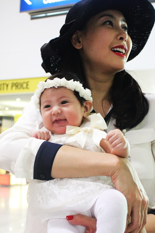 Hai mẹ con của hoa hậu nổi bật lúc xuất hiện. Khi đang làm thủ tục, người đẹp vẫn luôn tay dỗ dành, ru ngủ con gái.