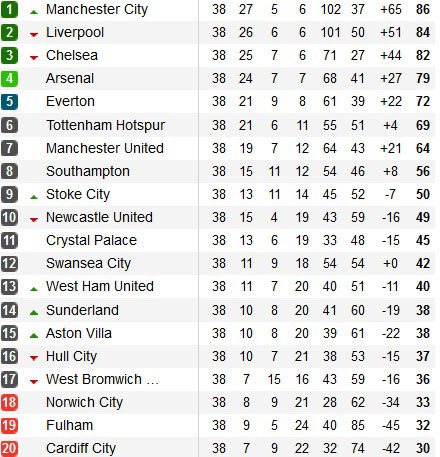 Trận đấu khép lại, sân The Etihad như nổ tung. Không có số thời gian nắm giữ ngôi đầu nhiều như Liverpool, Arsenal hay Chelsea, nhưng những bước chạy nước rút thần tốc trong giai đoạn cuối mùa giải của thầy trò Pellegrini đã giúp họ lần lượt qua mặt, Arsenal, Chelsea và cả chính Liverpool. Một chiến quả xứng đáng cho những nỗ lực không biết mệt mỏi.