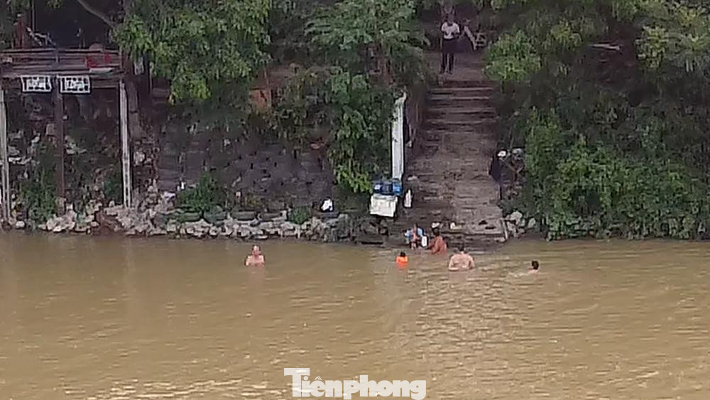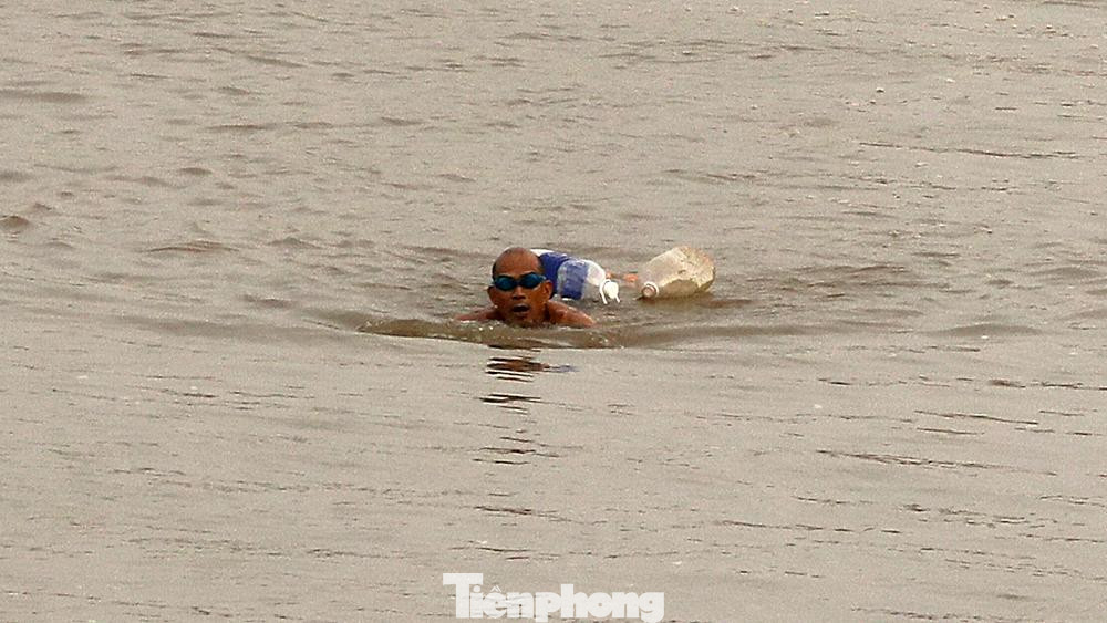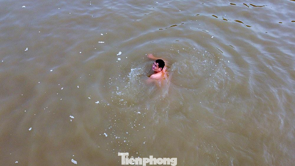 Bơi ra trụ cầu Long Biên dù đã có lệnh cấm. |