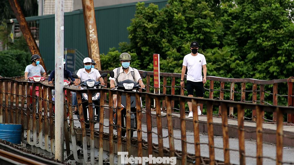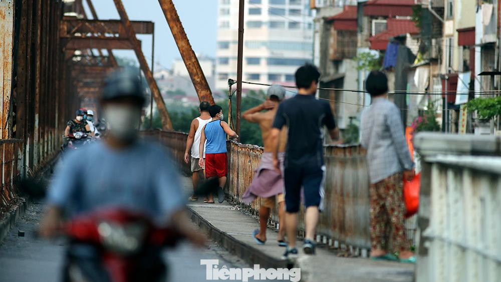| Cũng như trên mặt cầu Long Biên, một số thời điểm vẫn xuất hiện đông người trong những ngày Hà Nội cách ly toàn xã hội để phòng dịch COVID-19. |