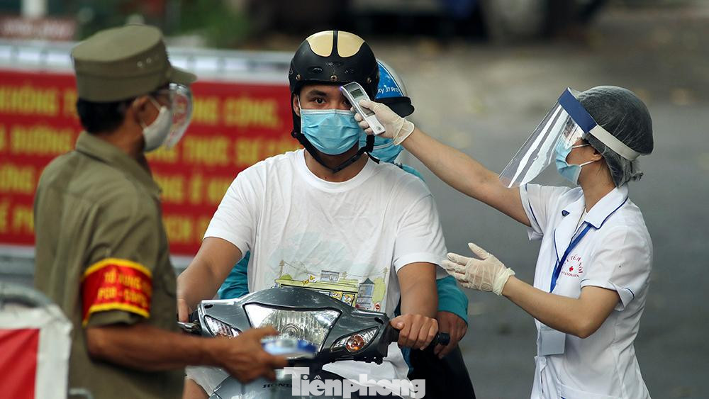 | Phía bên kia cầu Long Biên (Quận Long Biên), chốt kiểm tra y tế được chính quyền lập để kiểm tra 100% người và phương tiện qua lại. |