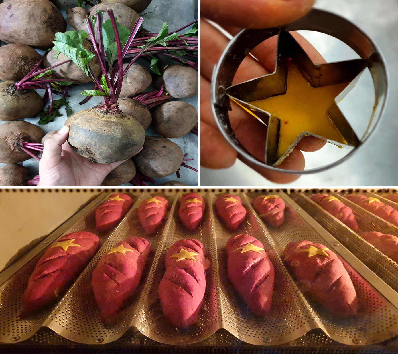 Về tạo hình của bánh, màu của vỏ bánh trước dùng trái thanh long ruột đỏ nhưng khi ra sản phẩm, bánh có màu đỏ hồng chưa đúng với tinh thần của lá cờ Tổ quốc vì vậy, quán đã chuyển sang củ dền và kết quả tạo màu khả quan hơn. Để giữ dáng bánh căng tròn không bị nhăn hoặc quá giòn, dễ vỡ vụn, quán đã làm vỏ bánh mỏng hơn vỏ bánh truyền thống một chút.