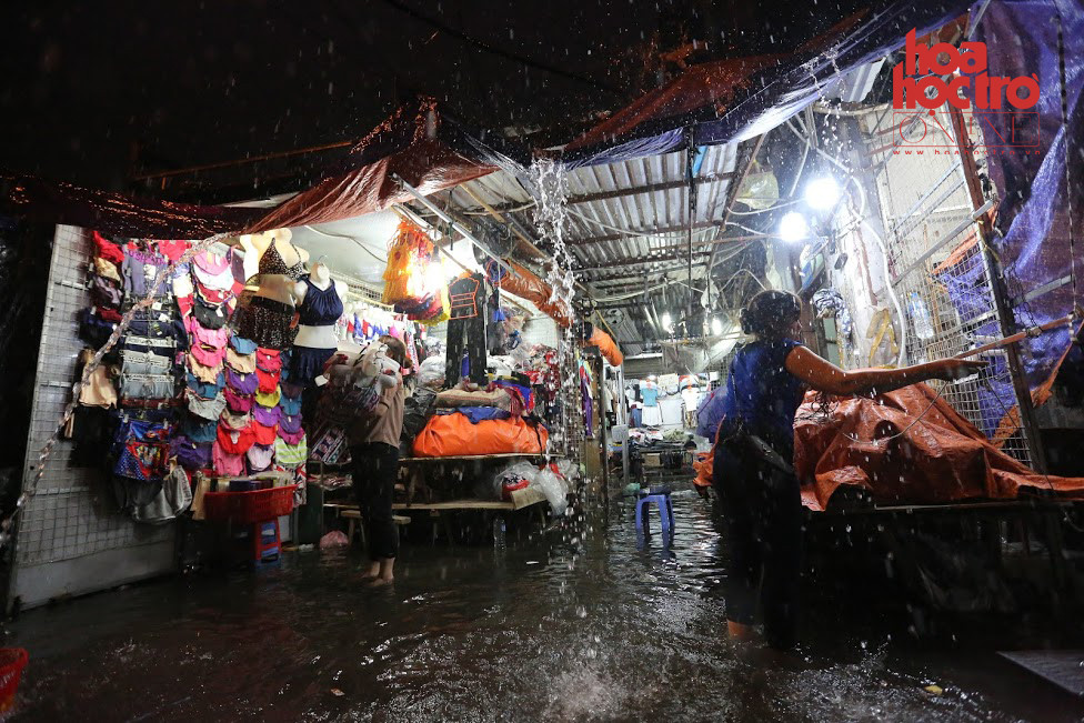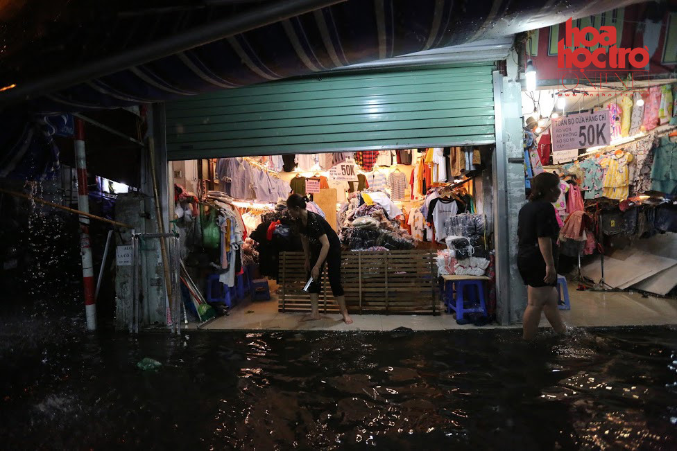 Các gian hàng tranh thủ dọn hàng sớm vì nước đã ngập qua bậc cửa, không thể bày hàng.