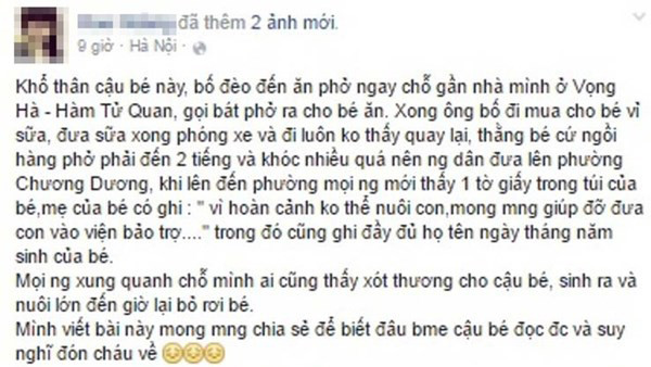 Facebook H.H. chia sẻ với nội dung: "Khổ thân cậu bé này, bố đèo đến ăn phở ngay chỗ gần nhà mình ở Vọng Hà - Hàm Tử Quan, gọi bát phở ra cho bé ăn. Xong ông bố đi mua cho bé vỉ sữa, đưa sữa xong phóng xe và đi luôn không thấy quay lại, thằng bé cứ ngồi hàng phở phải đến 2 tiếng và khóc nhiều quá nên người dân đưa lên phường Chương Dương, khi lên đến phường mọi người mới thấy 1 tờ giấy trong túi của bé, mẹ của bé có ghi: "vì hoàn cảnh không thể nuôi con, mong mọi người giúp đỡ đưa con vào viện bảo trợ...." trong đó cũng ghi đầy đủ họ tên ngày tháng năm sinh của bé…"