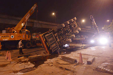 Theo người dân sống ở quanh khu vực, vào thời điểm trên, họ đang ngủ trong nhà bỗng nhiên nghe một tiếng “rầm” rất lớn, chạy ra tới nơi thì thấy chiếc xe cẩu cỡ lớn đổ sập chắn hết mặt đường Nguyễn Xiển hướng đi từ Linh Đàm về Khuất Duy Tiến. Ngay lập tức người dân đã gọi điện thông báo cho lực lượng chức năng.