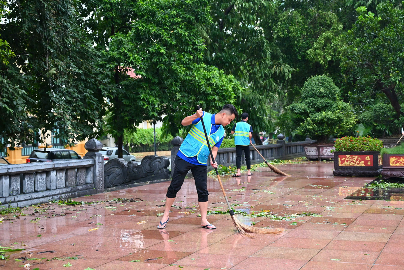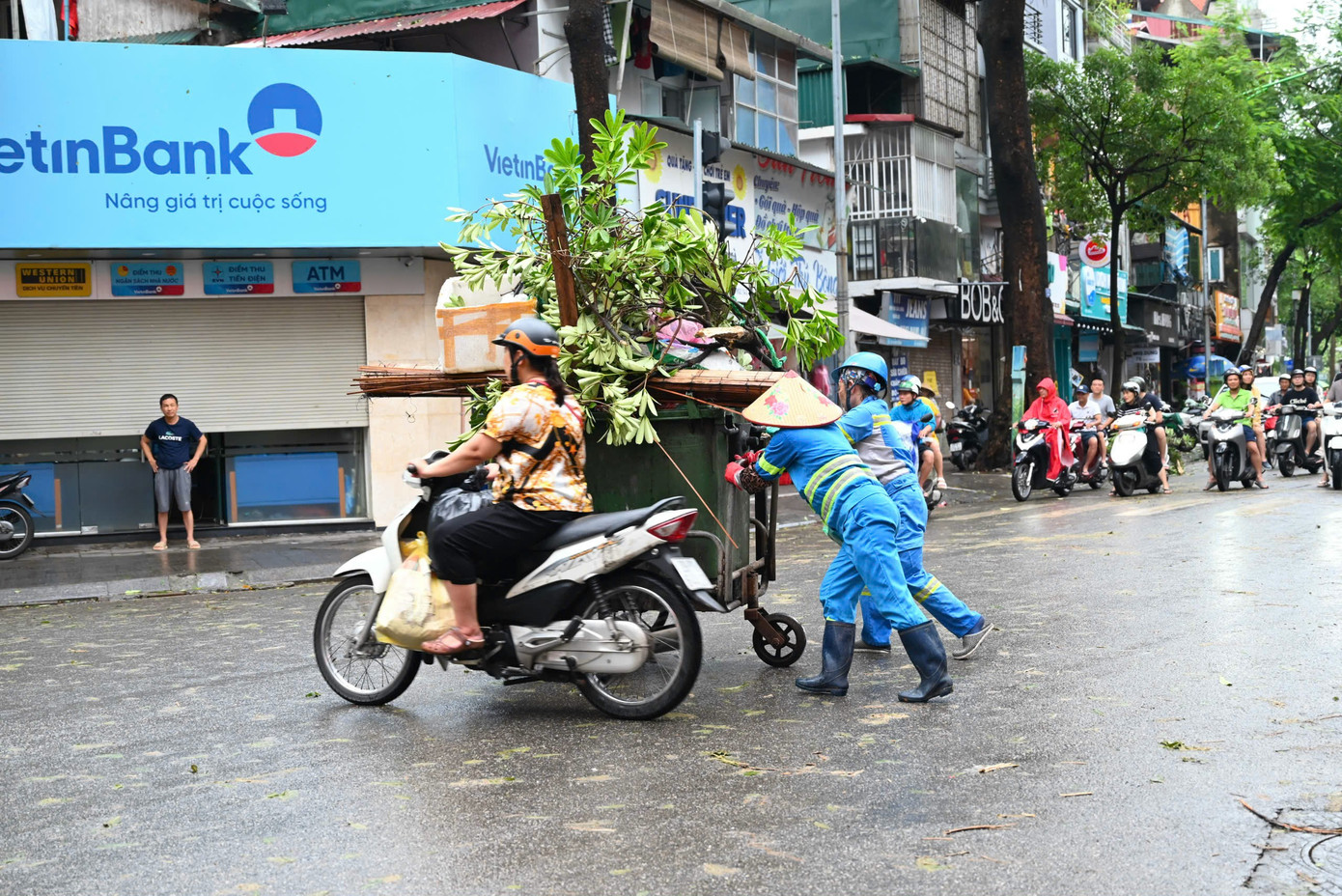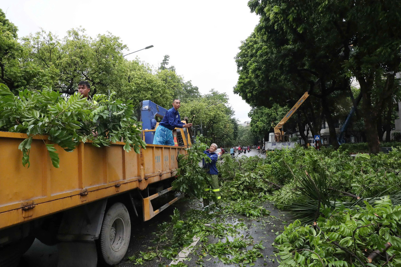 | Do ảnh hưởng của bão số 3, nhiều cây xanh trên địa bàn thành phố đã bị đổ gẫy, gẫy cành… gây ảnh hưởng đến trật tự an toàn giao thông, mỹ quan đô thị, vệ sinh môi trường. Từ 4h sáng ngày 8/9, Công ty TNHH MTV Môi trường đô thị Hà Nội (Urenco) đã huy động 100% nhân viên vệ sinh để dọn dẹp rác thải, lá cây ngập tràn trên đường phố. |