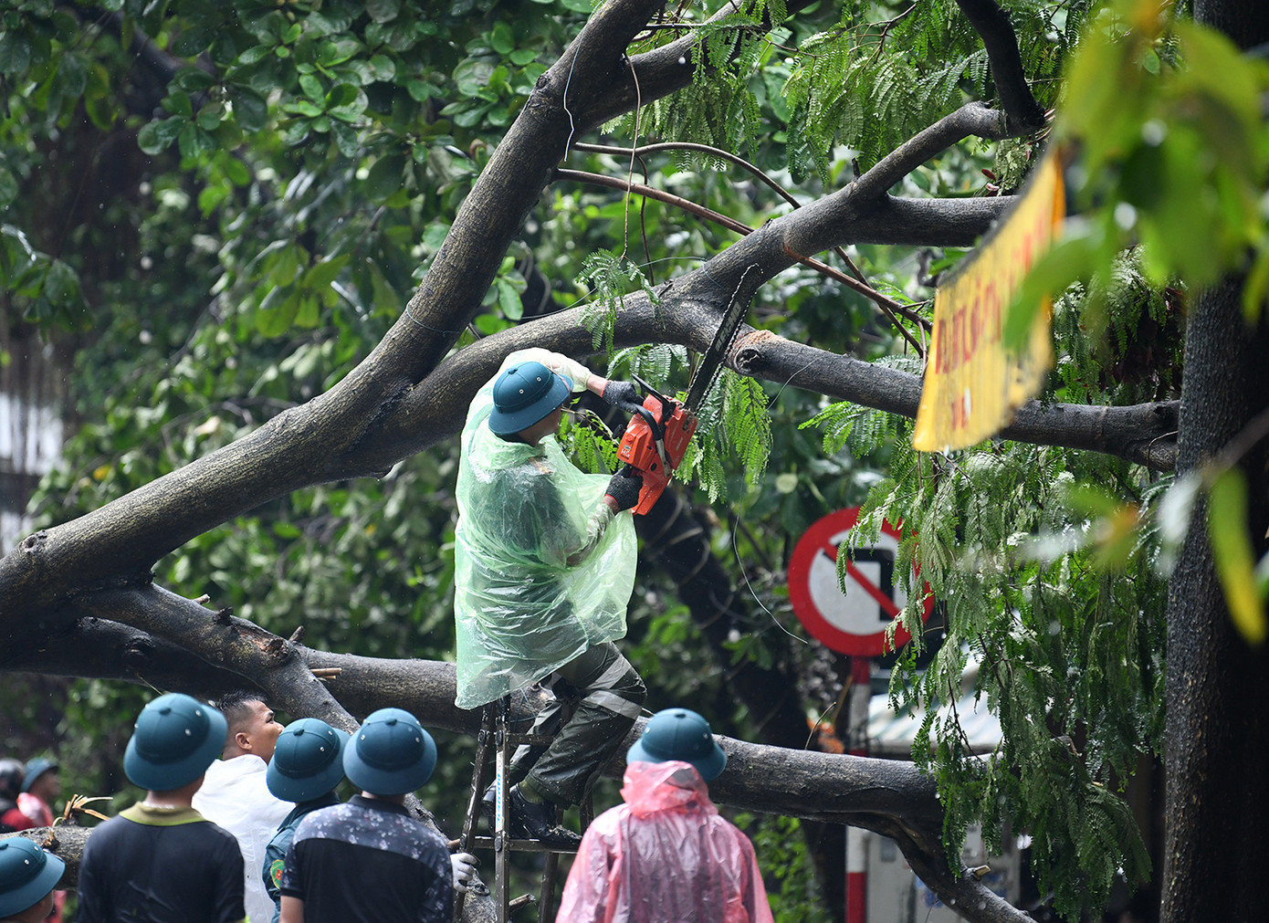 | Xử lý cây đổ chắn ngang đường tại Cầu Giấy. |
