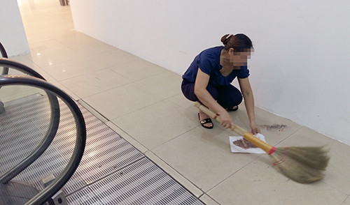 Sáng 10/8, chiếc thang cuốn từ tầng 2 lên tầng 3 của tòa nhà đã tạm dừng hoạt động. Những mảnh vỡ vụn của viên gạch ở đoạn thang tiếp giáp với sàn tầng 2 đang được một nhân viên thu dọn. Một tấm nhựa ở sàn tiếp giáp thang cuốn với sàn tầng 2 bị vỡ một đoạn dài khoảng 30 cm.