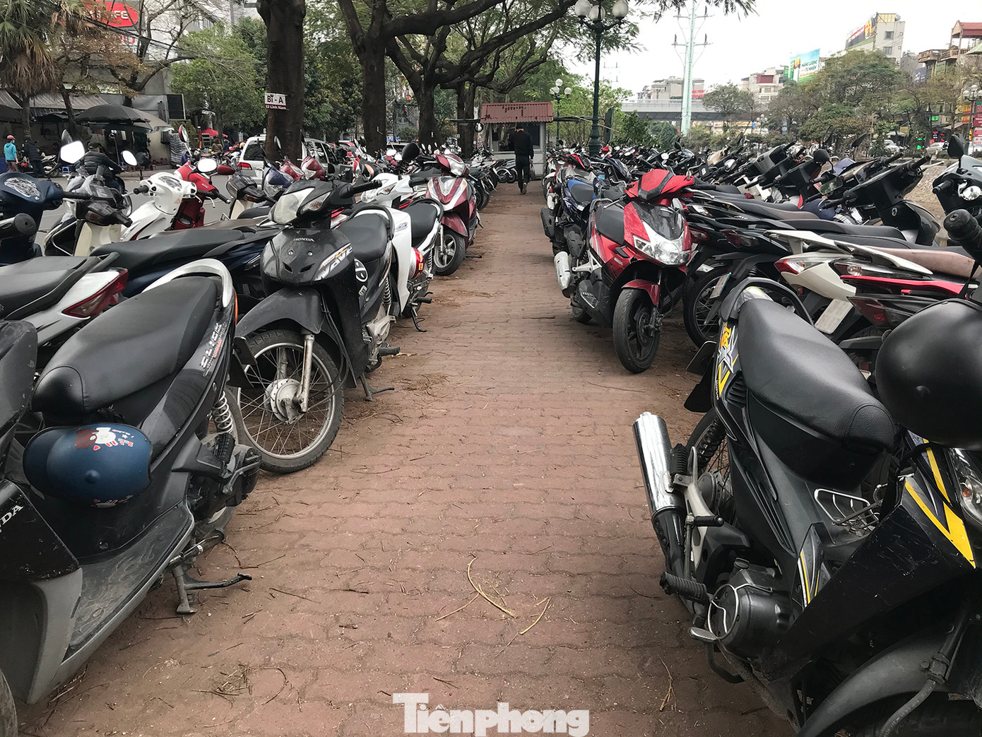 | Bãi trông giữ xe máy dài hàng trăm mét trên vỉa hè đầu đường Tam Trinh, đoạn trước tòa nhà VTC Online. Ảnh: Trường Phong |