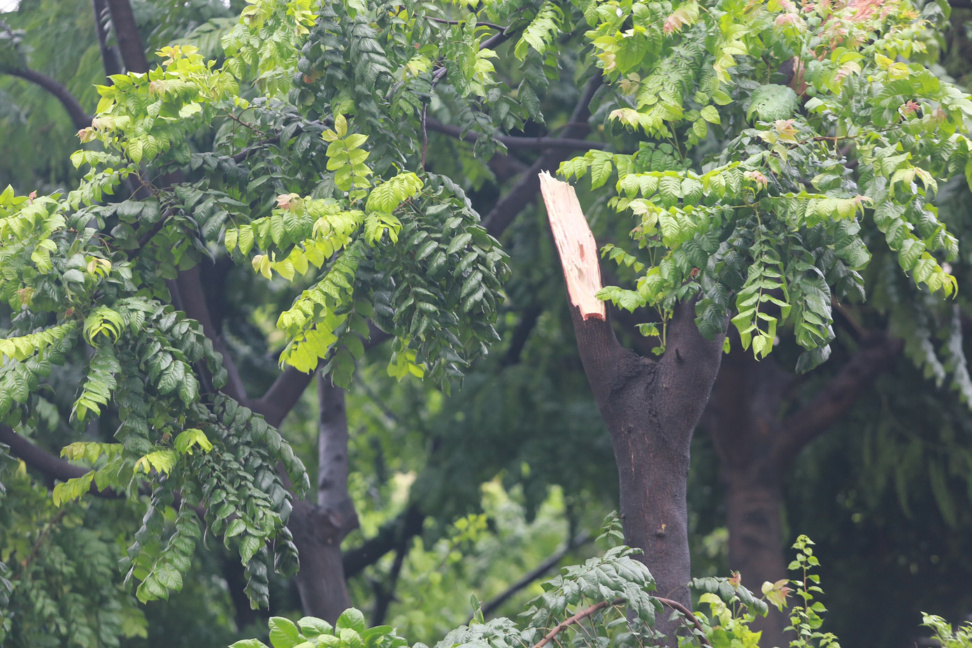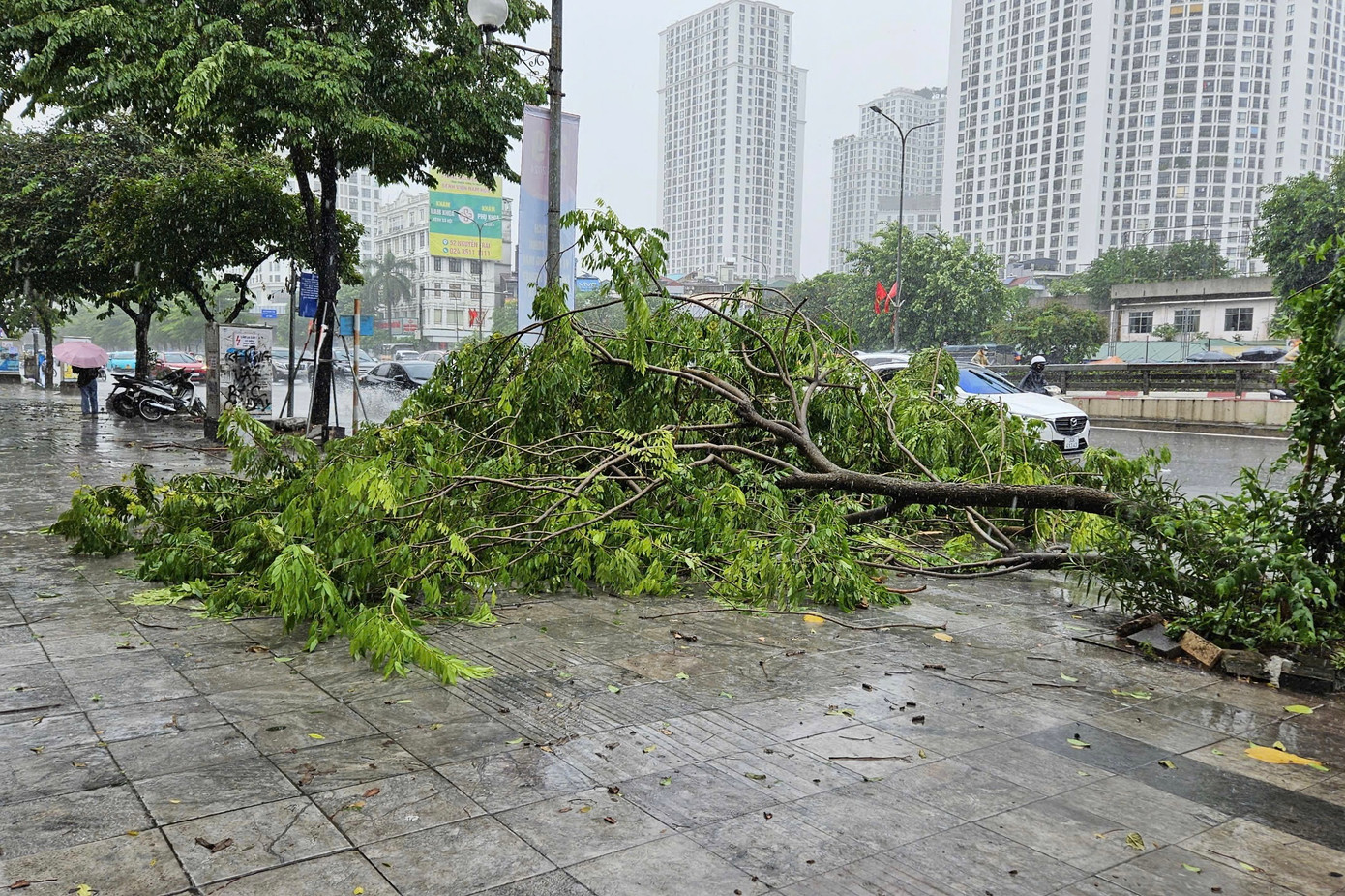 | Cành cây đổ ra đường, gây khó khăn cho các phương tiện giao thông. |