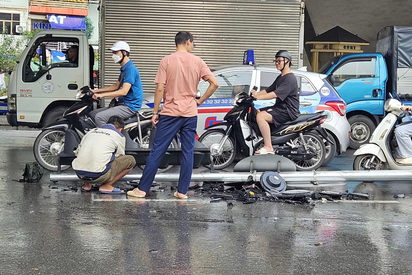 | Lực lượng chức năng xử lý đèn giao thông bị đổ sau cơn mưa lớn. |