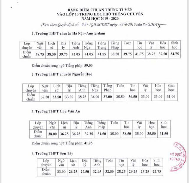 Sở GD&ĐT Hà Nội vừa công bố điểm chuẩn vào lớp 10 THPT chuyên năm 2019. Theo đó, điểm chuẩn cao nhất thuộc lớp chuyên Anh của Trường THPT chuyên Hà Nội - Amsterdam với 42,05 điểm.