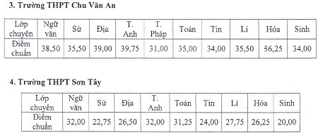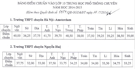 Điểm chuẩn đợt 1 vào các trường THPT chuyên và trường THPT có lớp chuyên của Hà Nội cụ thể như sau: