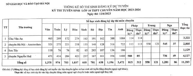 TPO - Sở Giáo dục và đào tạo Hà Nội (GD&ĐT) Hà Nội vừa công bố số lượng học sinh đăng ký dự tuyển vào lớp 10 của các trường THPT công lập không chuyên và chuyên năm học 2023-2024.